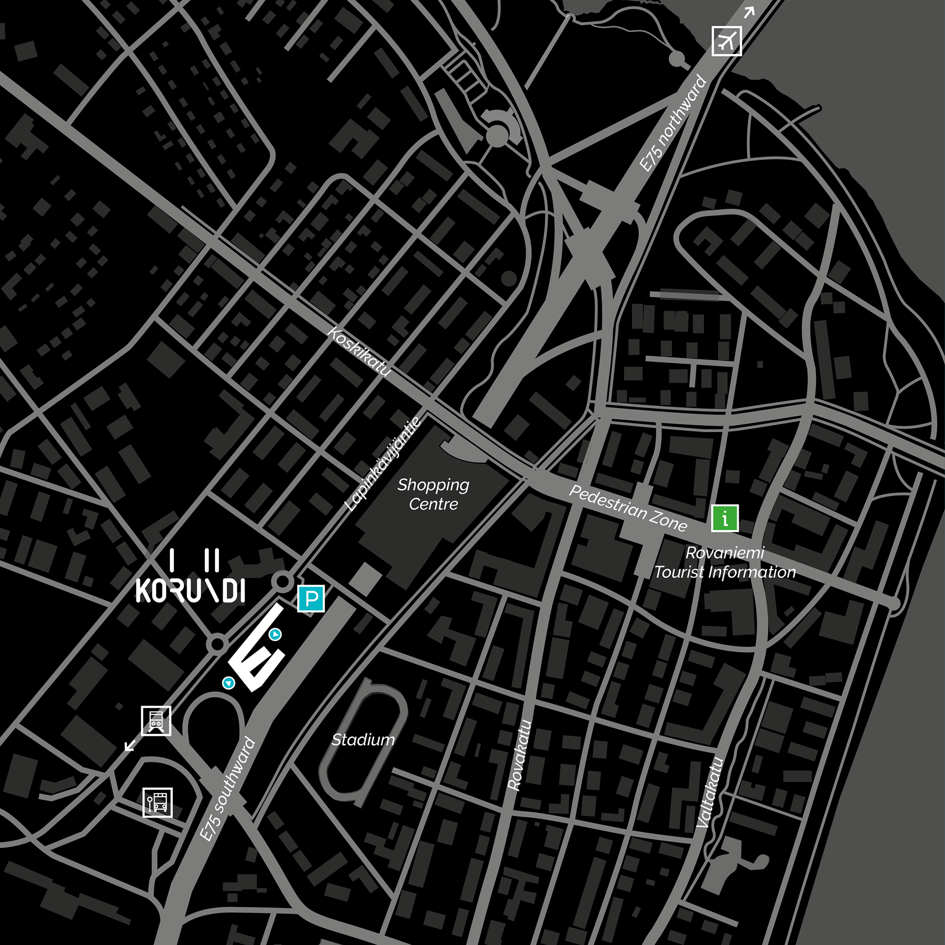 Korundi is located in Rovaniemi along the northbound Highway 4. Korundi is situated within walking distance of the Rovaniemi city centre, close to the bus and train stations. The Revontuli Shopping Centre is located right next to Korundi House of Culture.