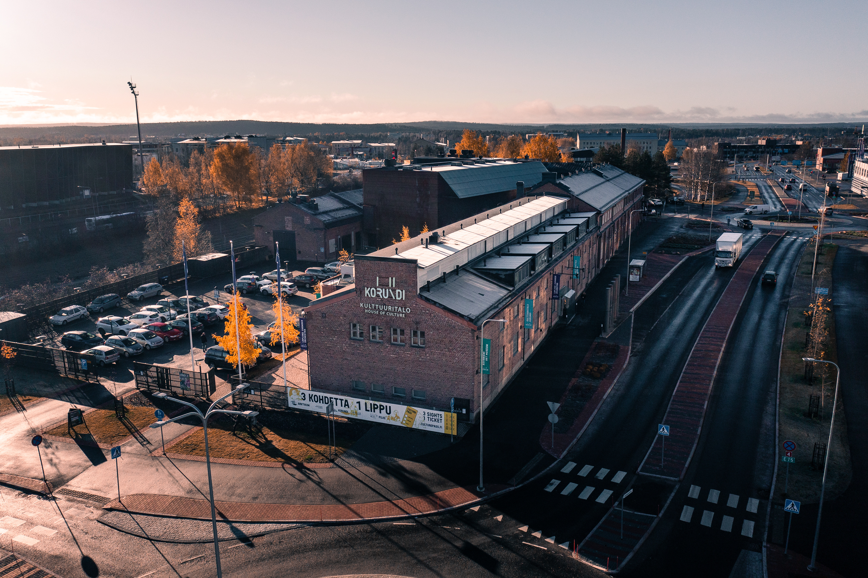 Korundi is located in Rovaniemi along the northbound Highway 4. The massive red-brick building of the mail truck depot, built in 1933, is a good landmark when navigating to Korundi. This building, now home to the House of Culture, is one of the few buildings in Rovaniemi that survived the Second World War. Korundi is situated within walking distance of the Rovaniemi city centre, close to the bus and train stations. The Revontuli Shopping Centre is located right next to Korundi House of Culture.